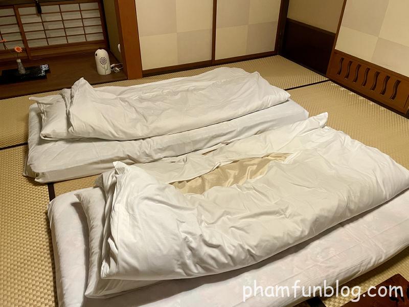 寝具は床に敷くお布団タイプで、夕食時にスタッフの方が敷いてくれました。