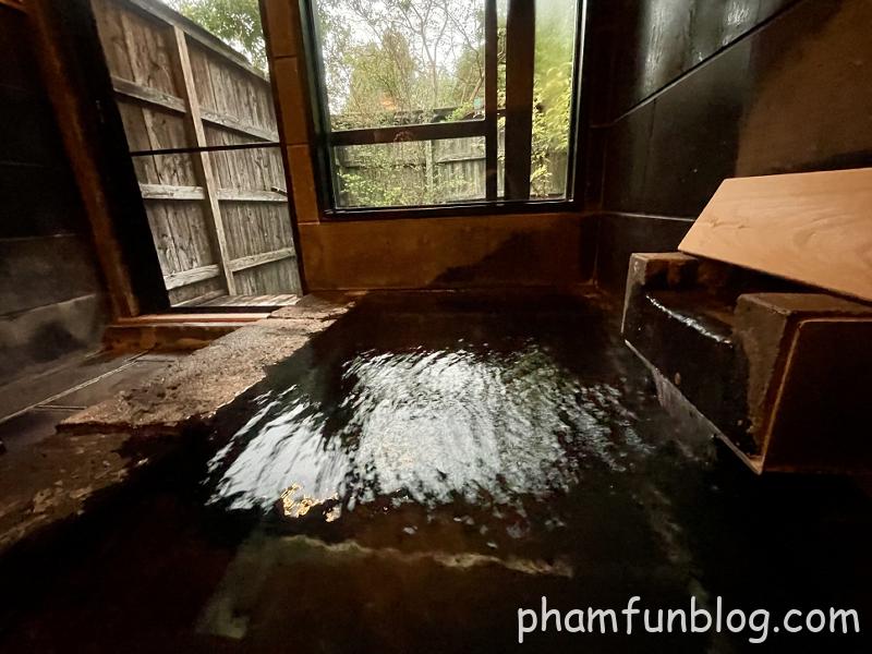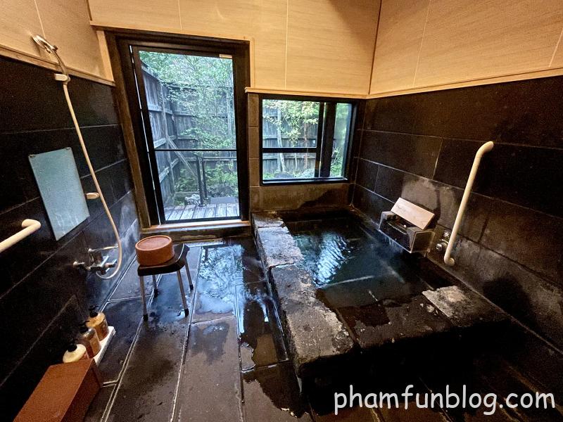 内風呂は石造りの湯船で、1〜2人が足を伸ばして入れる客室温泉としては十分な広さがありました。
