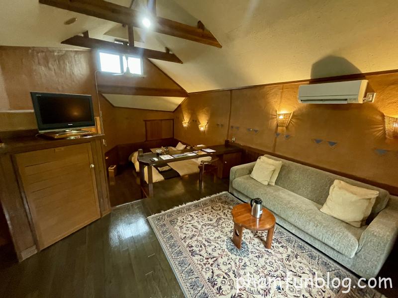 コテージ風の造りで、ソファがあるリビングとベッドルームがありました。