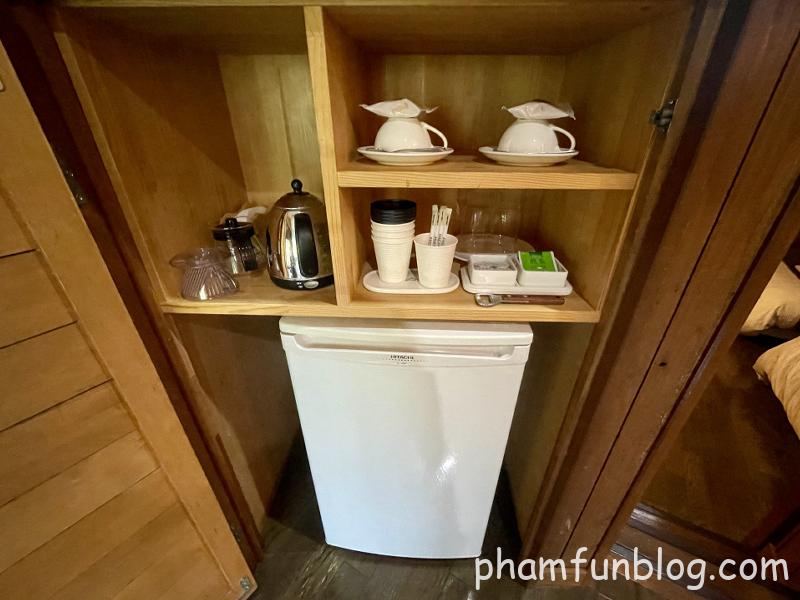 客室には冷蔵庫(ミニ冷凍庫付き)、電気ケトルが設置されていて、お水、コーヒーセット、お茶セット、お茶菓子などが用意されていました。