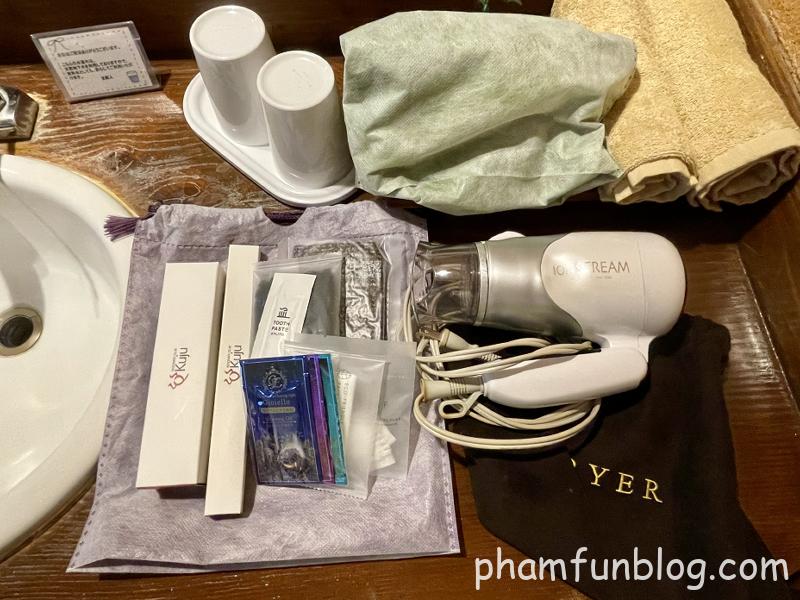 客室のアメニティは歯ブラシ、クシ、スキンケアセット(クレンジングオイル、化粧水、乳液)、コットン、綿棒、ボディウォッシュタオルなど、一通り揃っていました。