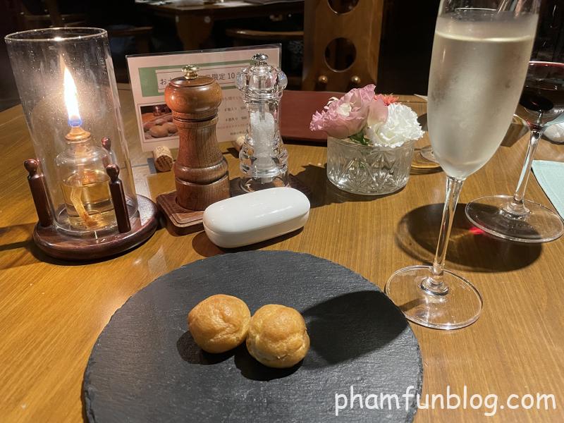 アミューズでは奥豊後豚のリエットが入ったプチシューをいただきました。