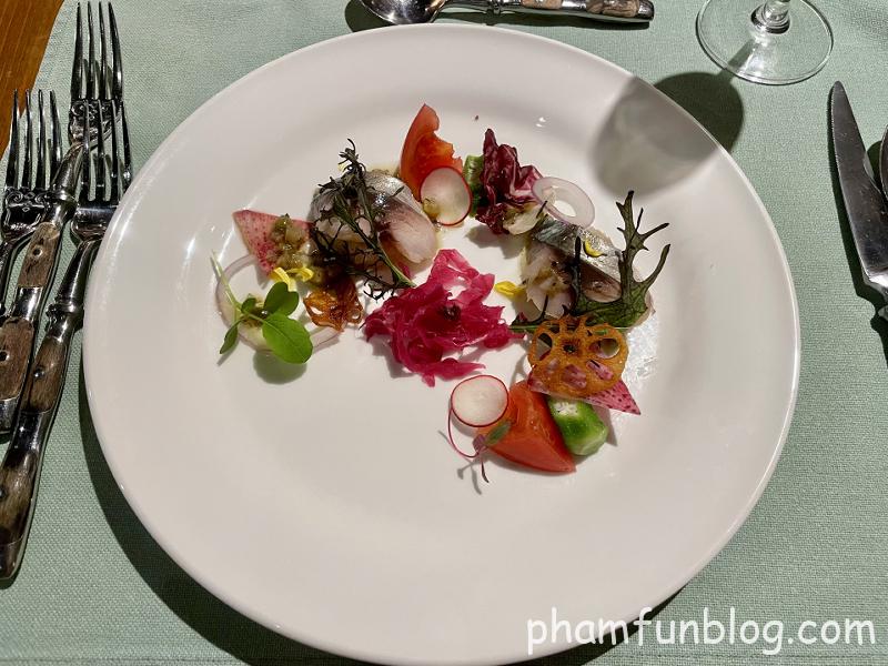 オードブルでは鯖の燻製をお野菜と一緒にいただきました。